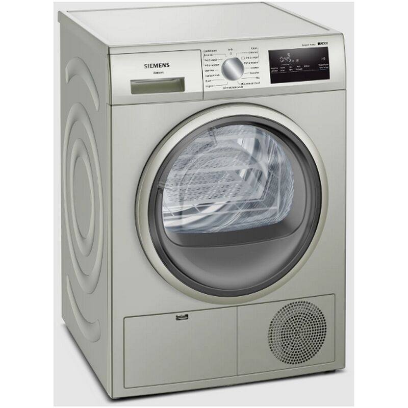 Asciugatrice Siemens iQ300 WT45HVX1FR con pompa di calore iSensoric, asciugatura molto efficiente. Schermo LED: chiara visualizzazione delle informazioni relative al ciclo di asciugatura e facile da usare. AutoDry: asciugatura precisa e delicata che preserva i tuoi capi. Programma outdoor: asciuga i tuoi capi impermeabili e tecnici senza rovinarli. Filtro easyClean per una facile pulizia del filtro del condensatore. Tipo di prodotto: asciugatrice. Tipo di costruzione: autoportante. Classe di efficienza energetica¹: A++. Energia²: 236kWh. Capacità: 1-8 kg. Durata del programma³: 205min. Livello sonoro: 65 dB (A) re 1 pW. Classe di efficienza di condensazione?:B. Efficienza di condensazione?: 81%. Volume del cestello: 112 l. tamburo morbido. Piano rimovibile: no. Cerniera della porta: Destra. Design antivibrazione: stabilità e silenziosità. Telaioportavetroargentoacciaio inox,grigio scuroProgrammi/Opzioni. Programmi: Cotone, Sintetici, Misti, Asciugatura lana nel cestello, Outdoor
