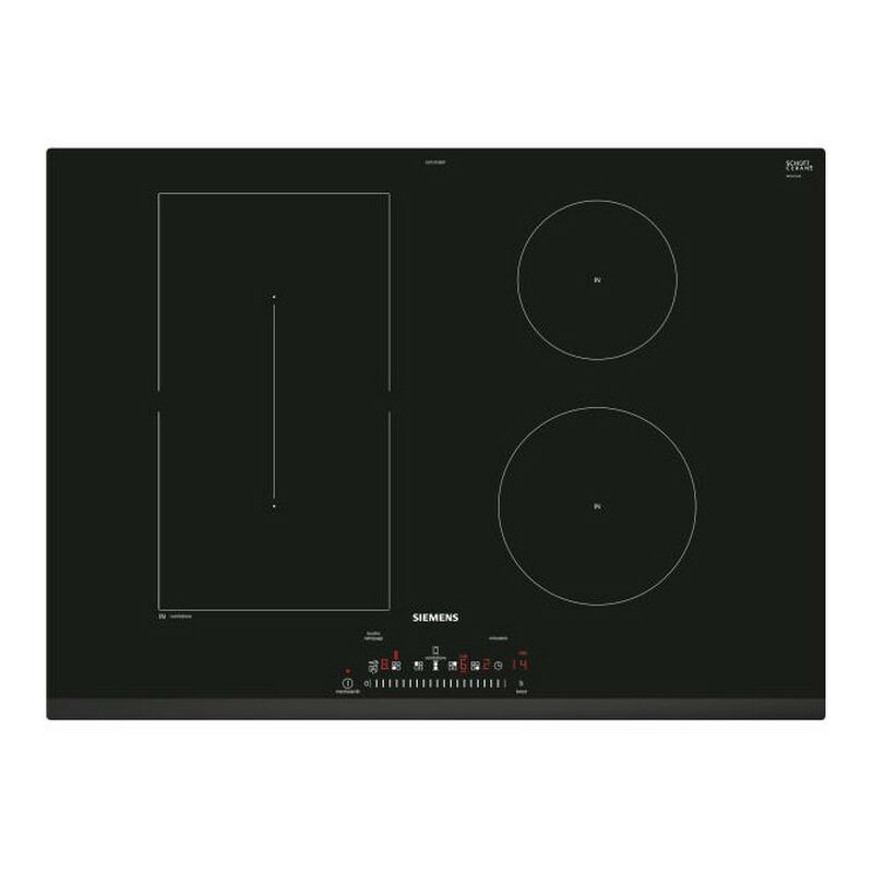 Piano cottura a induzione Siemens ED731FSB5F iQ500 con 4 zone di cui 1 CombiZone 2x Ø 19 cm 3,7 kW: più flessibilità combinando due zone cottura. Funzione PowerMove: 2 potenze preimpostate. Funzione QuickStart: rilevamento automatico dei contenitori sulla zona di cottura. Funzione ReStart: in caso di arresto improvviso del piano, conservazione della temperatura iniziale per 4 secondi. Riconoscimento automatico della panoramica. Pulsante pulizia: possibilità di bloccare il pannello comandi per 20 secondi per pulire il tavolo in caso di troppo pieno. Funzione di gestione dell'energia: si adatta facilmente a qualsiasi impianto elettrico, indipendentemente dalla potenza della rete elettrica. Visualizzazione del consumo energetico. Tipo di prodotto: piastra. 17 livelli di potenza. PowerBoost su ogni famiglia. Timer cut-out per ogni famiglia. Dispositivi di sicurezza per bambini e antisurriscaldamento. Controlli tattili TouchSlider. Materiale: vetro ceramico. Zona di induzione: 4. Camino/i