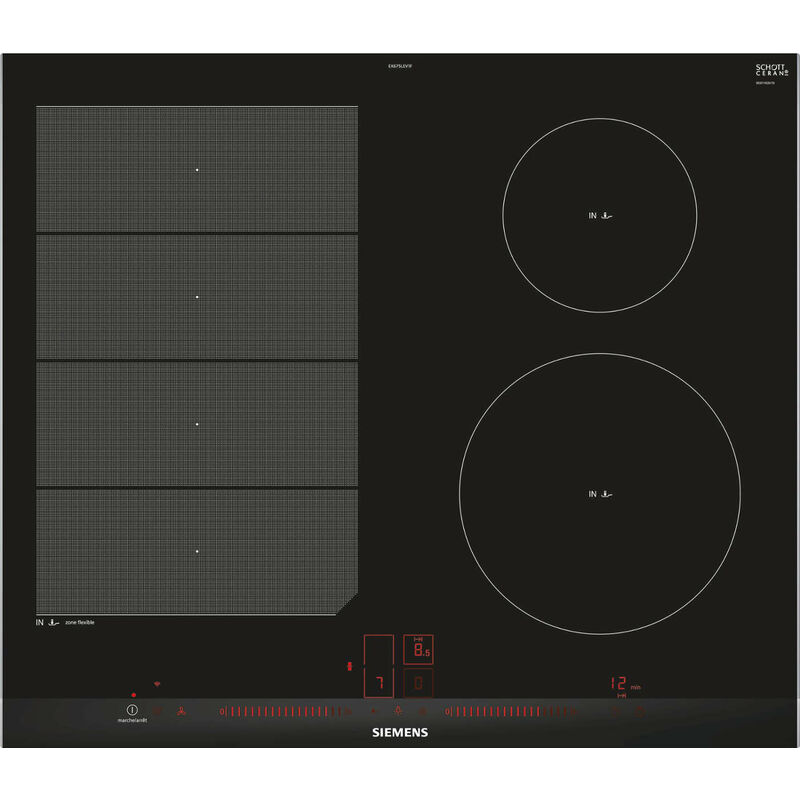Piano cottura a induzione Siemens iQ700 EX675LEV1F nero con profilo in acciaio inox. L'innovativo piano cottura a induzione? Niente più bruciature di cibo grazie al thermoSensor.Home Connect: informazioni sul piano cottura, niente più domande da porre - con l'app Home Connect facile da usare. Il sistema CookConnect permette di controllare le varie funzioni della cappa tramite il piano cottura Cook liberamente grazie alla superficie di cottura extra-large: puoi posizionare le tue pietanze ovunque sulla zona flexInduction.powerMove Plus consente un controllo intuitivo grazie a tre zone di cottura predefinite con diverse temperature., per un controllo facile e intuitivo del piano cottura. la temperatura all'interno della pentola, in modo che il cibo non si bruci più.Design: display digitale.Dual lightSlider control.Potenza: 4 piastre a induzione di cui 1 flexInduction (zona libera dotata di 4 induttori ovali) Zone di cottura: 1 x Ø 380 mm x 240 mm, 3,3 kW (powerBoost 3,7 kW) o 2 x Ø 190