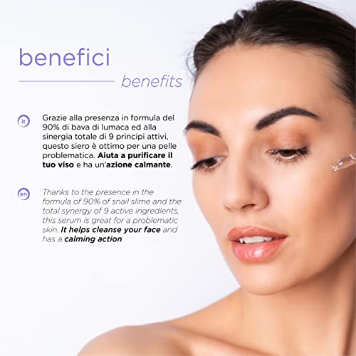 La Bava di Lumaca (concentrata al 90%) ha azione esfoliante, purificante, nutritiva, rigenerante, idratante e antiossidante. Siero viso anti imperfezioni, ideale per pelli grasse e impure, come astringente per pori dilatati e per placare l'acne, anche adolescenziale