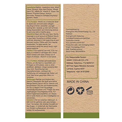 Ingredienti naturali e organici: contiene ingredienti naturali e organici senza sostanze chimiche ruvide, come l'aggiunta di retinolo al prodotto 2,5% di acido ialuronico idratante. Meno irritante per garantire che le persone non vengano danneggiate, sicuro e sano.