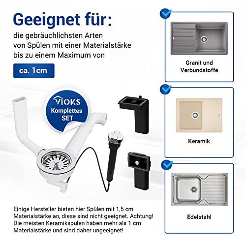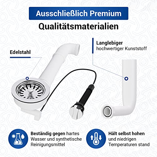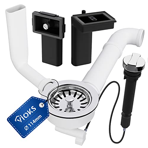 Scarico con valvola eccentrica, con azionamento a rotazione e deviatore in plastica con collegamenti accorciabili, guarnizioni incluse per lavelli da cucina.
