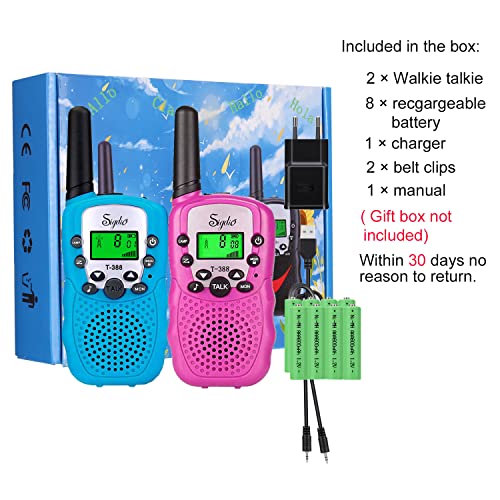 Sigdio T-388 Walkie Talkie Bambini con 8 Pezzi Batterie Ricaricabili e Caricabatterie Ricetrasmittente per Bambini Walkie Talkie Torcia VOX 8 Canali PMR446 Display LCD 4 Colori(Blu e Rosa)