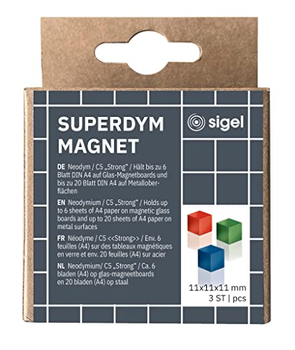 SIGEL BA725 Magneti SuperDym Artverum, forma a cubo, azzurro, rosso, verde, 3 pezzi, per lavagne magnetiche di vetro