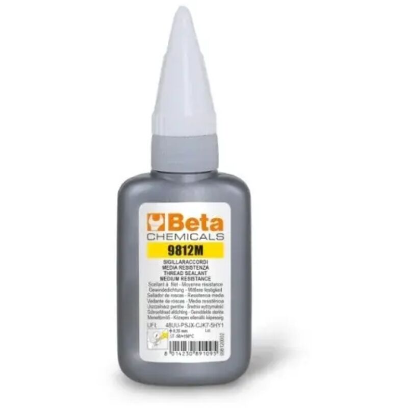 Ideale per sigillare raccordi filettati soggetti a manutenzione periodica. Permette lo smontaggio con l'uso di utensili manuali. Sigillaraccordi anaerobico per raccordi metallici filettati. Polimerizza a contatto con parti metalliche rettificate e in assenza di ossigeno. Garantisce una perfetta tenuta stagna verso liquidi e gas. Aumenta la robustezza del giunto. Tollera la leggera contaminazioni di olii. Elevata resistenza chimica (olii, acqua, gas). Protegge le filettature da corrosione e grippaggi da corrosione. Caratteristiche tecniche del sigillaraccordi BETA CHEMICALS 9812M Temperatura: -50/+150 °C Gioco diametrale: 0,35 mm Velocità di reazione blocco alla mano: 12/18 minuti Indurimento funzionale: 3-6 ore Viscosità 25°C: 20.000/40.000 mPa.s Coppia di svitamento INIZIALE: 27-35 Nm (ISO-10964) Coppia di svitamento RESIDUA: 20-30 Nm (ISO-10964)
