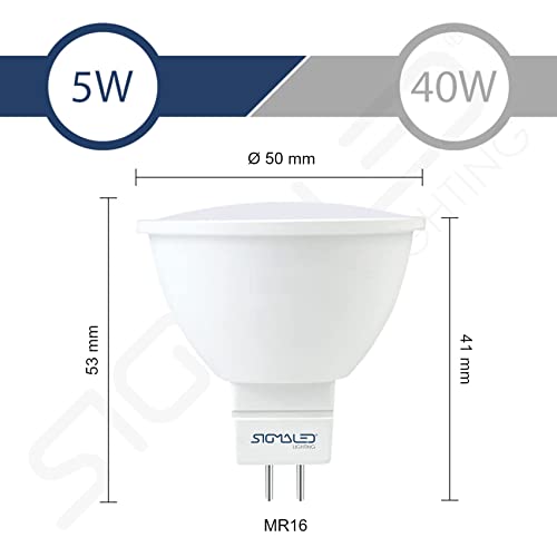 SIGMALED LIGHTING PACK 6 LAMPADE LED SPOT LED MR16 GU5.3 5W (=40W), 400 lumen, 12V DC, Faretto led luce bianca calda 2800K, 50x53mm, angolo 120°.