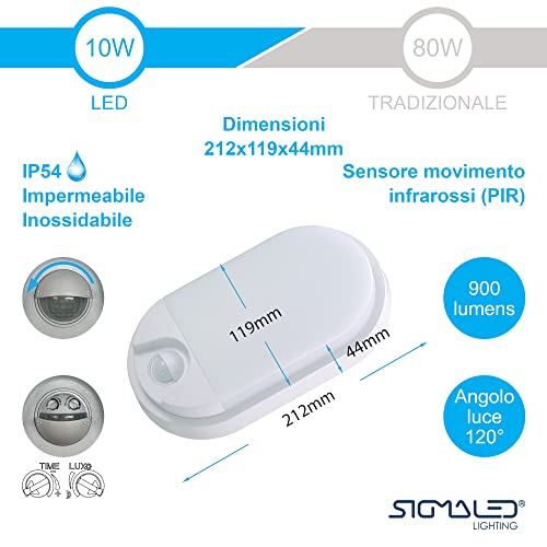 Sigmaled lighting, Plafoniera LED 10W con SENSORE di Movimento per esterni, Resistente all'acqua, Luce Naturale 4000K, 900Lm, Applique OVALE IMPERMEABILE IP54 da parete