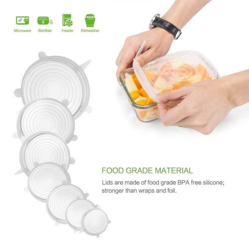 Kuke Silicone Stretch Coperchi Covers 6 pacchetti lavastoviglie e freezer sicuro con colori vivaci (Trasparente)