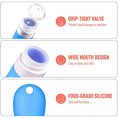 Materiale affidabile: la bottiglia da viaggio riutilizzabile è realizzata in silicone di alta qualità per uso alimentare, resistente all'usura e durevole, ha un'elevata flessibilità, non è facile da rompere, non è tossica e insapore.