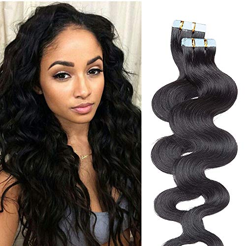 Silk-co 50cm Adesive Extension Capelli Veri Ricci Body Wave #1 Nero Scuro 20 Fasce Tape in Extension Remy Hair 2.5g/fasce Capelli Brasiliani