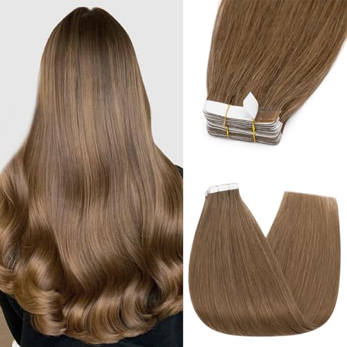 Silk-co Extension Biadesive Capelli Veri 10 PCS 40cm 25g 6 Marrone Chiaro Extension Capelli Veri Biadesivo Lisci Remy Hair Extension Invisibili
