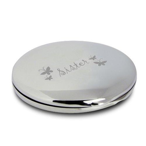 Silver Finish Engraved Sister Round Compact Mirror with Butterflies Great Gifts Idea for Birthday Gift Christmas Presents