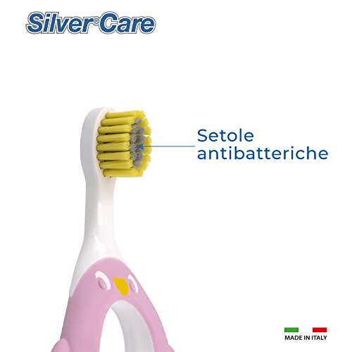 l'impugnatura è stata studiata per la mano di un adulto che spazzola comodamente i denti del bebè e l'anello permette al neonato una presa più agevole