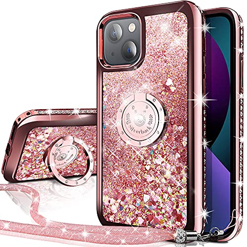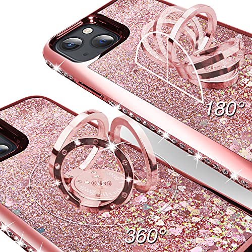 Silverback Cover per iPhone 14 Plus, Custodia Glitter di in Silicone TPU con 360 Gradi Anello e Cordino, Pendenza Colore Diamond Brillantini Liquido Paraurti Antiurto Case - Oro Rosa