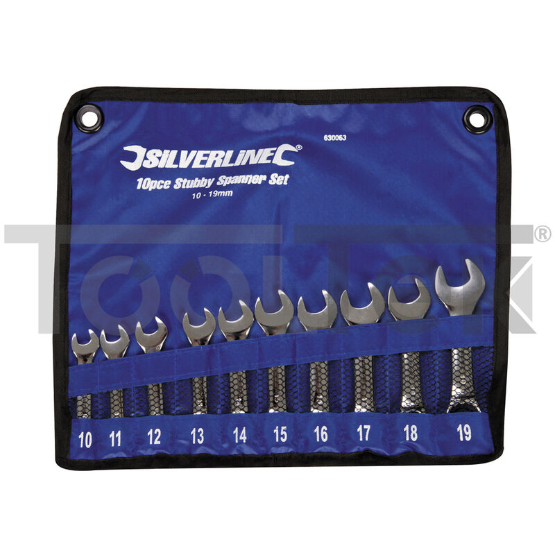 Set di chiavi combinate da 10pz .Testa a forchetta e testa poligonale inclinate di 15° per una maggiore capacità di accesso.Cromo vanadio fucinato a stampo, indurito e temprato.Finitura lucidata di alta qualità.Rotolo portautensili in nylon balistico ultraresistente.MISURE: 10, 11, 12, 13, 14, 15, 16, 17, 18 e 19 mm. Prodotto di qualità.