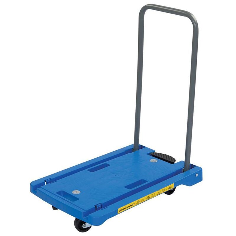 Carrello a piattaforma solido e leggero, con impugnatura pieghevole in acciaio. Meccanismo di bloccaggio a pedale. 2 cuscinetti per impedire al carico di scivolar via. Utile al trasporto di merci pesanti e voluminose. Dotato di 2 rotelle fisse e 2 girevoli con cuscinetti a sfera. Max. capacità di carico 100 kg. Dimensioni (L x l x H): 690 x 385 x 735 mm. Peso 4 kg.