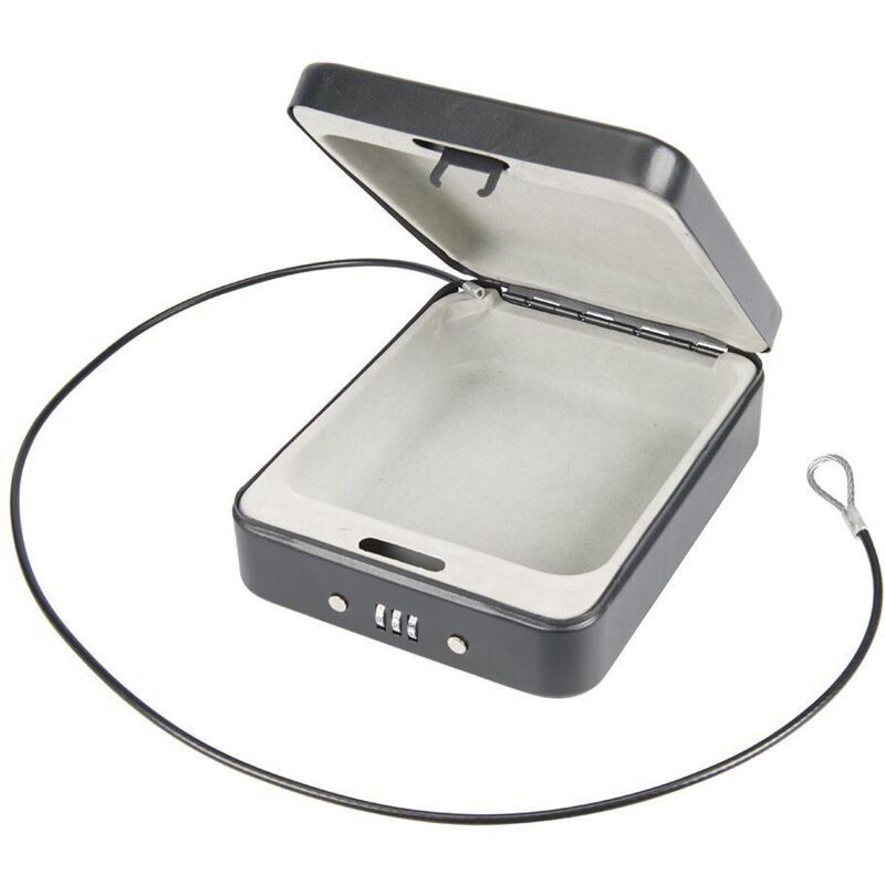 Cassetta di sicurezza portatile resettabile a chiusura con combinazione di 3 cifre Resistente struttura in acciaio solido e morbido con rivestimento interno Leggero e facile da trasportare Ideale per il fissaggio navigatori satellitari, occhiali da sole, portafogli e chiavi Include un cavo d'acciaio di 900 cm Coffre résistant en acier portable avec code 3 chiffres personnalisable. Intérieur à garniture douce. Léger et facile à transporter. Parfait pour ranger en toute sécurité les GPS, lunettes de soleil, portefeuilles et clés dans les voitures, caravanes et camping-cars. Avec un câble d'attache de 900 mm en acier.