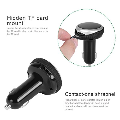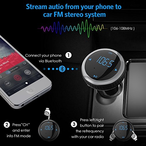 Bluetooth FM Transmitter larghezza compatibilità: trasmettitore FM per auto, senza fili, funziona con la maggior parte dei dispositivi dotati di Bluetooth, come iPhone, Samsung, HTC, LG, Blackberry, tablet e iPad ecc. Puoi anche i file MP3 incolla U disk o scheda micro SD a giocare. Canali FM 87.5 - 108.0 MHz completamente coperto.(Il suono sarebbe meglio se voti la canale 106,0 ~ 108,0)