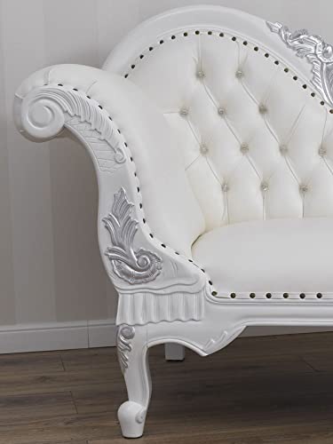 Simone Guarracino Luxury Design Dormeuse Joana Stile Barocco Moderno Divano 2 posti chaise Longue Bianco Laccato Lucido e Foglia Argento Ecopelle Bianca Bottoni Crystal SW