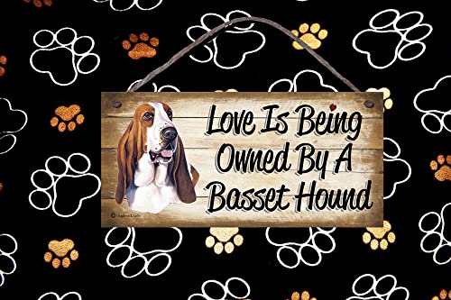 Simpatica targa in legno con l'immagine di un cane Bassotto e la frase "Love is... being owned by a Dachshund".