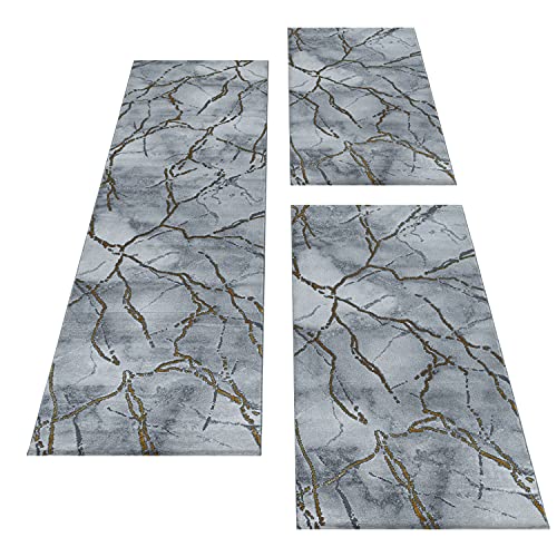 SIMPEX Set di tappeti per camera da letto, a pelo corto, motivo marmo, 3 pezzi, oro, colore: oro, set da letto: 2 x 80 x 150 + 1 x 80 x 250 cm