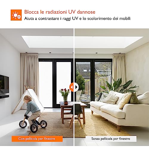 PROTEZIONE DAL SOLE: la pellicola in vetro smerigliato statico di Simple Fix blocca il 96% dei raggi nocivi, permettendo alla luce morbida di inondare la stanza. Protegge dalle scottature, protegge gli occhi dalla luce diretta del sole e dallo sbiadimento dei mobili.