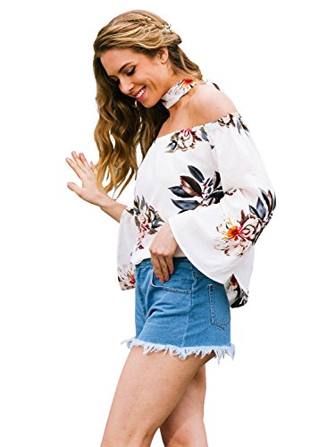 Simplee Apparele Donne Colletto Collo Libero dalla Spalla Floreale Fiore Impronta Camicia Camicetta a Maniche Lunghe Bardot Cima Bianca