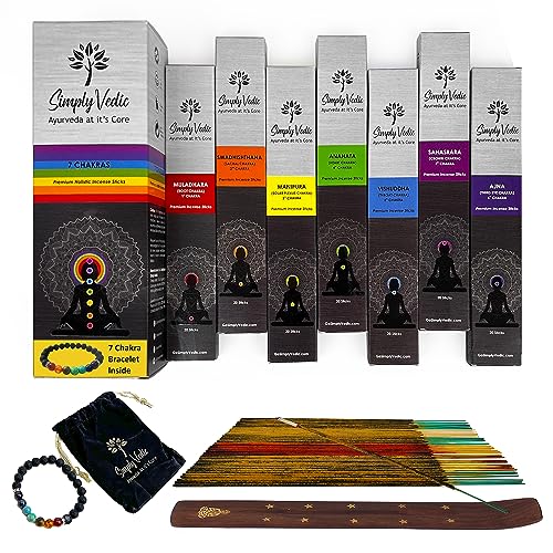 Simply Vedic 7 Chakra Bastoncini di incenso Premium Agarbatti con 7 Chakra Malocchio Bracciale in pietra lavica per meditazione, Yoga, Reiki, Guarigione (Confezione da 20 bastoncini x 7 varianti)