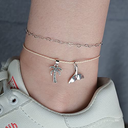 Simsly Cavigliera a strati Boho Cavigliera a onde d'argento Cavigliere da donna regolabili con albero di cocco e ciondolo a coda di pesce Catena del piede Gioielli per donne e ragazze