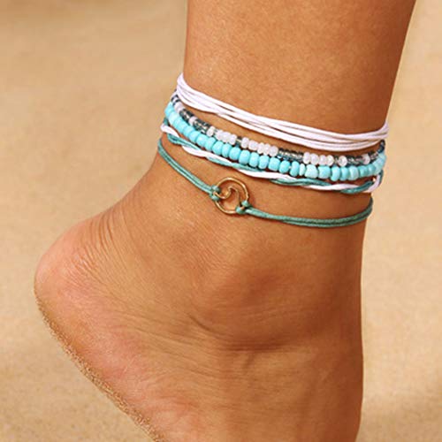 Simsly Cavigliera in tessuto, stile boho, con turchesi, con perline, accessori per piedi, da donna/ragazzae (blu/5 pezzi)