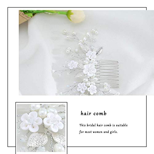 Simsly Pettine per capelli da sposa a forma di fiore, con foglie di argento e strass luccicanti, Capelli Pettini Nuziale, Accessori per capelli per donne e ragazze, colore argento