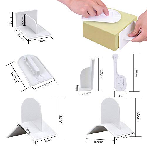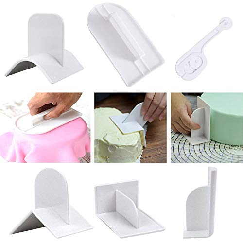 Package Include 6pcs cake smoother decoration tools: 1 * surface smoother, 2 * corners smoother with angle angle and right angle, 2 * large and small sides smoother, 1 * cutter embosser with 3 wheel