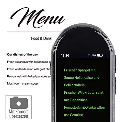 Traduzione online tra 105 lingue:Inglese, Giapponese, Russo, Tedesco, Spagnolo, Francese, Italiano, Greco, Olandese, Polacco, Danese, Ceco, Finlandese, Portoghese, Arabo, Cinese, Thai e molto altro ancora • Supporta l'impostazione manuale della lingua e il rilevamento automatico • Fotocamera da 5 MP per la traduzione di testi su pubblicità, Menu e molto altro ancora