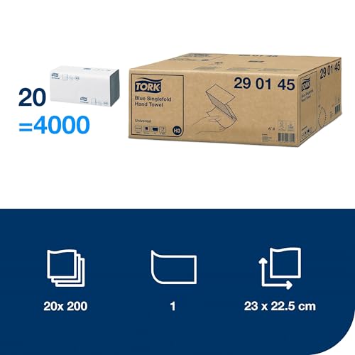 Tork Blue Singlefold Hand Towels 290145 - H3 Universal Paper Folded Towels for Singlefold Dispensers - Economic, 1-Ply, Blue - 20 x 200 Sheets