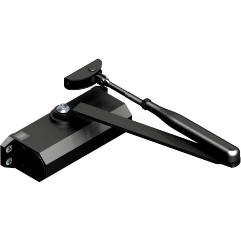 Chiudiporta DOM COMPACT 1000 nero c/arresto. Caratteristiche: - Chiudiporta. - Materiale: Corpo in alluminio pressofuso. - Forza di chiusura variabile EN 2-3-4. - Angolo massimo di apertura 160o. - Per porte di larghezza fino a 110 cm con peso fino a 80 kg. - Velocita' di chiusura regolabile. - Ambidestri. - Con fermo. - Colore: Nero.