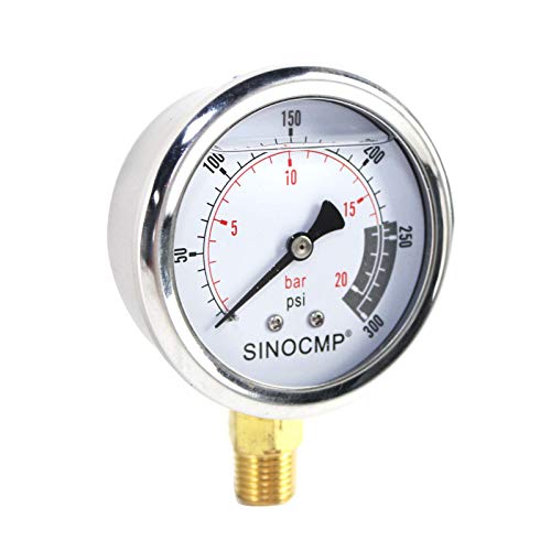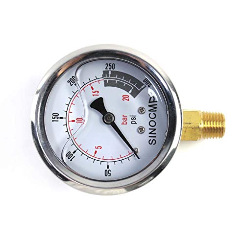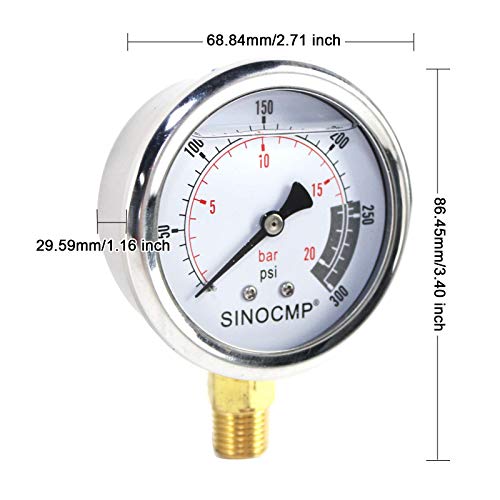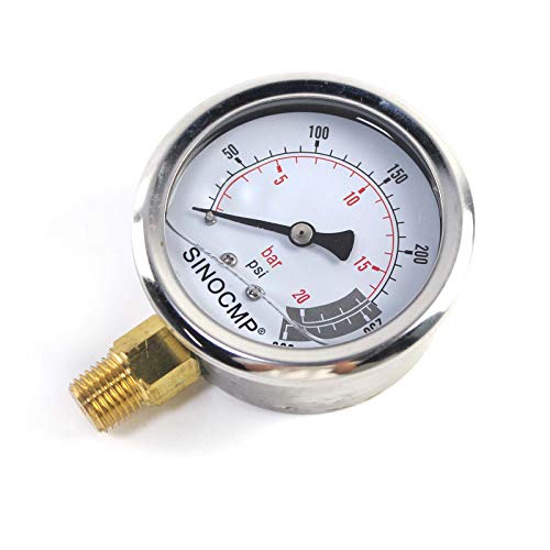 SINOCMP - Manometro idraulico 2Mpa/0-20Bar/0-300PSI Economico Multi Purpose Doppia Scala In Acciaio Inox Glicerina Riempito Gauge