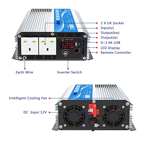 Inverter onda sinusoidale pura da 2000 Watt: onda sinusoidale pura da 2000 W 12 V e potenza di picco 4000 W, con display a LED, prese doppie da 240 V CA e porta USB da 1 x 2,4 A