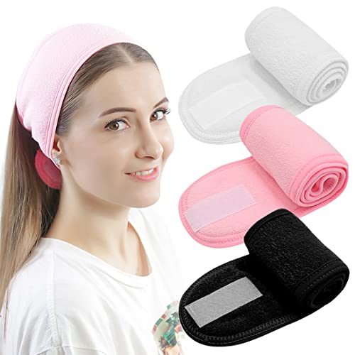 SIOPPKIK 3 Pcs Fascia Spugna Makeup, Fascia Capelli Spugna Trucco Fascia Capelli Donna Trucco,Regolabile Spa Fascia Capelli Terry Trucco Doccia Yoga Sport Spa con Magic Tape (Bianco,Nero,Rosa)