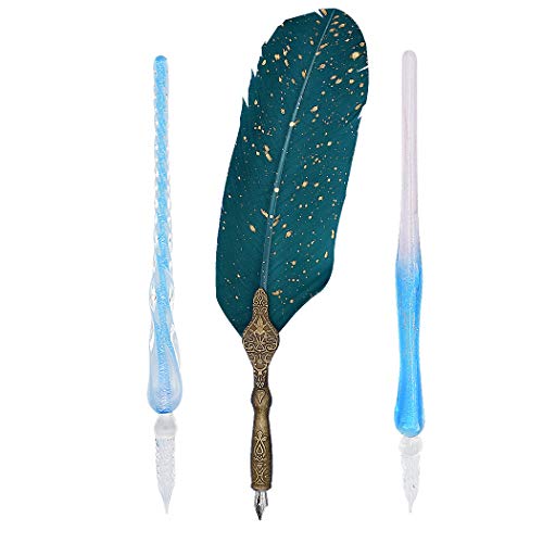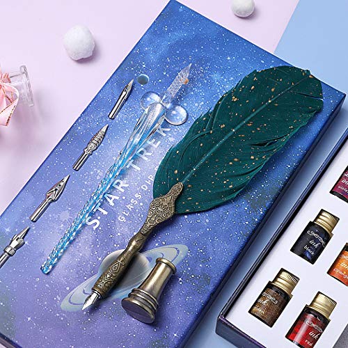 Set di calligrafia perfetto: set perfetto per principianti e calligrafi avanzati. Il set include 1 penna in vetro, 1 penna a piuma, 10 bottiglie di inchiostri a colori diversi, 2 portapenne, 4 pennini. Penna in vetro borosilicato ad alta qualità