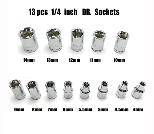 【Complete set di 1/4 "prese e accessories】This socket wrench set comprende 46 metrica pezzi. Detiene la maggior parte dei 1/4 "metric prese: 4, 4.5, 5, 5.5, 6, 7, 8, 9, 10, 11, 12, 13, 14 millimetri;