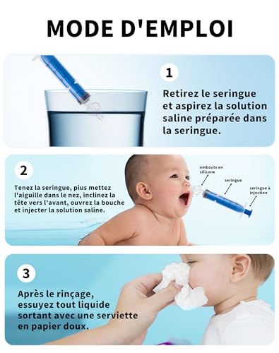 【Facile da Usare】: Passaggio 1: Rimuovere la siringa e aspirare la soluzione salina preparata nella siringa. Passaggio 2: Tenere la siringa, quindi inserire l'ago nel naso, inclinare la testa in avanti, aprire la bocca e iniettare la soluzione salina. Passaggio 3: Dopo il risciacquo, rimuovere il liquido che fuoriesce con un tovagliolo di carta morbido. La siringa nasale del bambino può essere riutilizzabile.