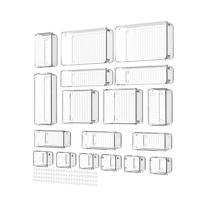 Sistema organizer per cassetti separati da 18 pezzi, organizer per cassetti antiscivolo, scatola portaoggetti con inserto per cassetto trasparente Supporta Dropshipping e vendita all'ingrosso. [Uso multifunzionale] 5 diverse dimensioni di custodie per organizer, adatte a cassetti di diverse dimensioni, possono essere utilizzate per conservare cosmetici, piatti, forniture per ufficio e gioielli per mantenere il tuo spazio pulito e indirizzarti a un aiuto per uno stile di vita ben curato.[Layout e impilabilità individuali] gli organizzatori di cassetti di diverse dimensioni possono essere fissati in diversi modi nel cassetto, grazie al design con angoli scorrevoli e arrotondati, può essere facilmente installato in qualsiasi cassetto o contatore. Grazie alla costruzione rialzata agli angoli, gli organizzatori impilati per risparmiare spazio per aumentare lo spazio e lo spazio di archiviazione.[Materiale durevole] realizzato con materiale di alta qualità per una lunga durata, il design