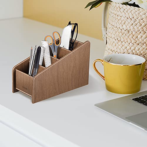 SITHON Organizzatore per Telecomandi con 4 Scomparti, Desktop Supporto per Controllo Remoto, Scatola Portaoggetti da Scrivania per TV Remote Control, Cancelleria, Penna, Ufficio Accessori, (Marrone)