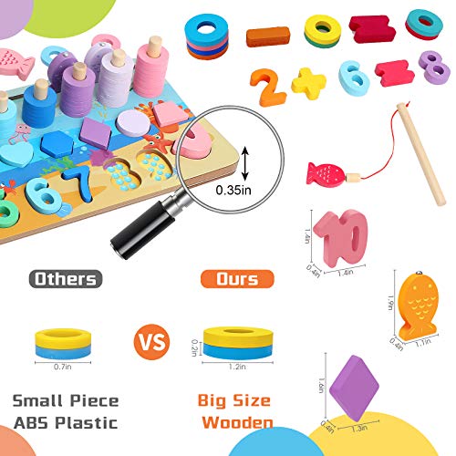 [Set di giocattoli Montessori 5 in 1] A differenza di altri prodotti contenenti anelli di plastica, tutte le nostre parti sono in legno, compresi gli anelli in legno e di grandi dimensioni, nessun rischio di deglutizione. Il puzzle di smistamento in legno mai annoiato per bambini di 2 3 4 5 anni per divertirsi con vari giochi, include giochi di pesca, abbinamento di più colori, apprendimento di numeri e forme, conteggio e impilamento ecc.
