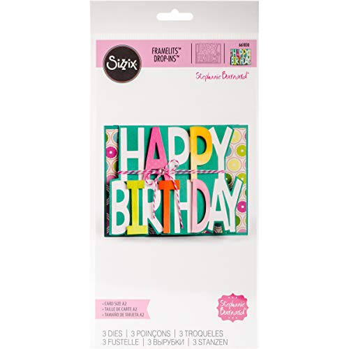 Stephanie Barnyard Frameless Card drop-ins Happy compleanno- 3 fustelle in metallo che includono una didascalia Happy Birthday, lo sfondo della parola e una cornice per tutto
