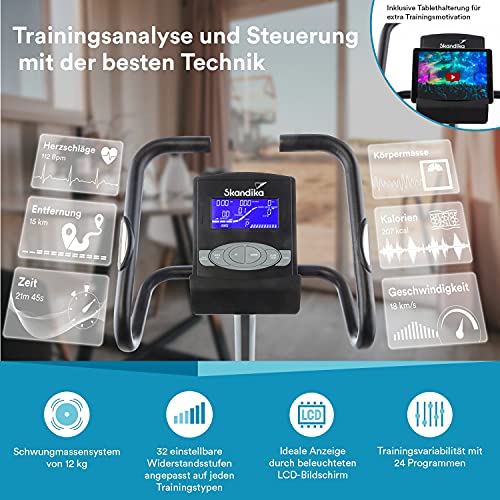 Skandika Ergometro Morpheus | Home Trainer, Massa volanica 12 kg, 32 Livelli, 24 programmi, Applicazione Compatibile con Kinomap, frequenza cardiaca, Supporto per Tablet, Fino a 150 kg (Nero/Argento)