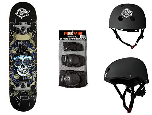 Skate-Max Set Junior Skateboard + Caschetto + Protezioni Modelli per Ragazzi dai 10 Anni in su (Skull)