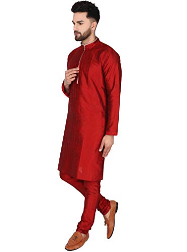 SKAVIJ Uomo Seta d'Arte Kurta Pigiama Set Indiani Indossano Abiti Rosso_XL