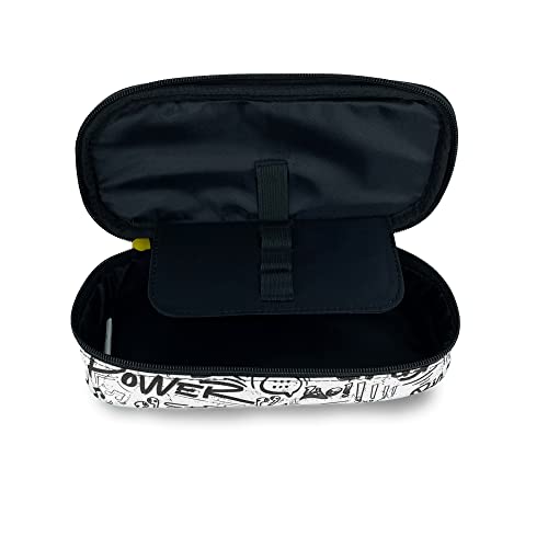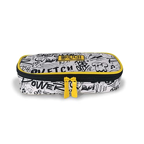 NE.ON! Sketch Astuccio Bianco Ragazzo Scuola Elementare, Media e Superiore Ovale 1 Zip con Doppio Cursore, Stile Urban con Stampa Graffiti e Dettagli Fluo, Tessuto Ecosostenibile PET Etichetta Gommata