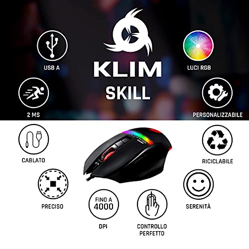 KLIM Skill Mouse da Gioco ad Alta Precisione, Mouse per Gamer USB PC, PS4 & Xbox One - 2023 Versione - DPI Regolabile - Tasti Programmabili - Presa Comoda - Nero
